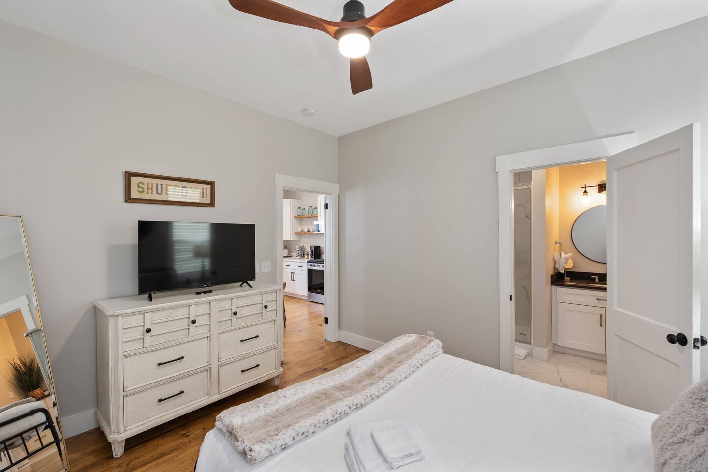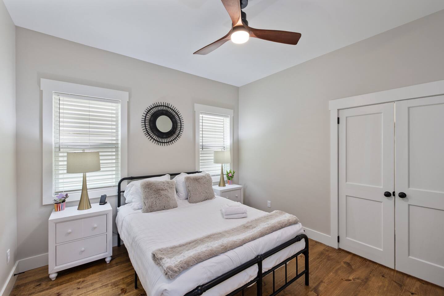Downtown comfort meets style. Modern two-story home just blocks from the Riverfront. Rest easy: 1 King & 1 Queen, both en-suite. Work & stream: fast Wi-Fi plus dedicated desk. Easy arrival: private parking, self check-in, fenced yard for pets, luggage drop-off on request. 5-min walk to shops & dining Full kitchen + coffee-bar