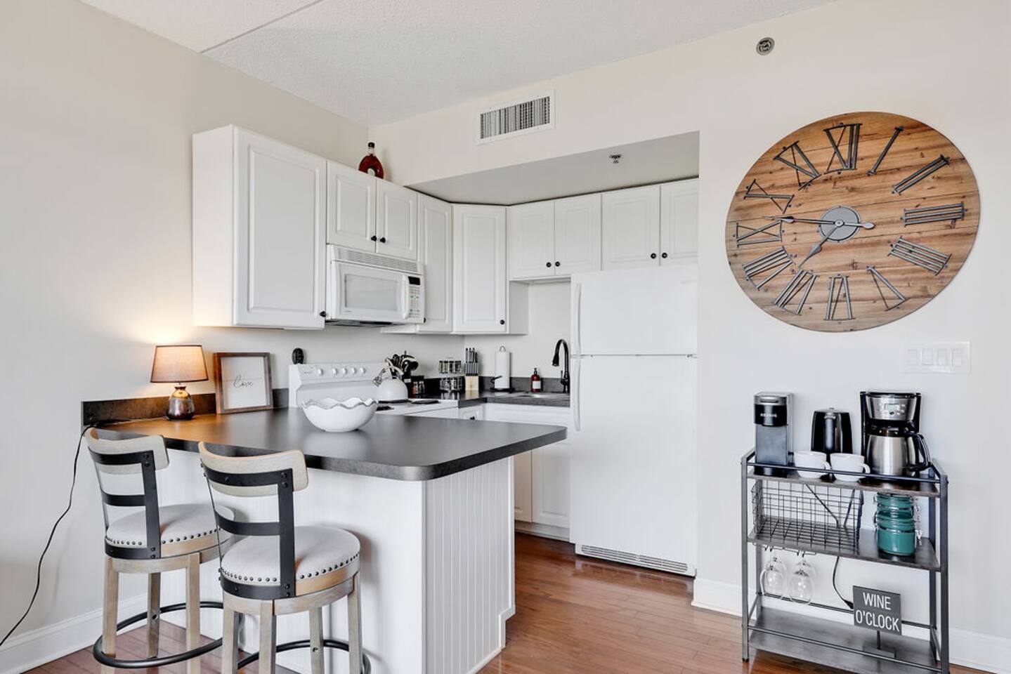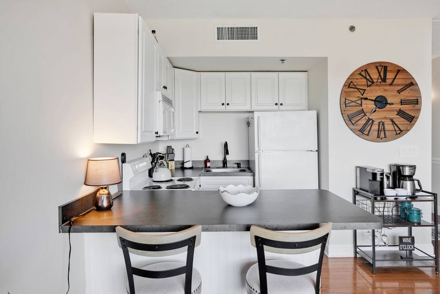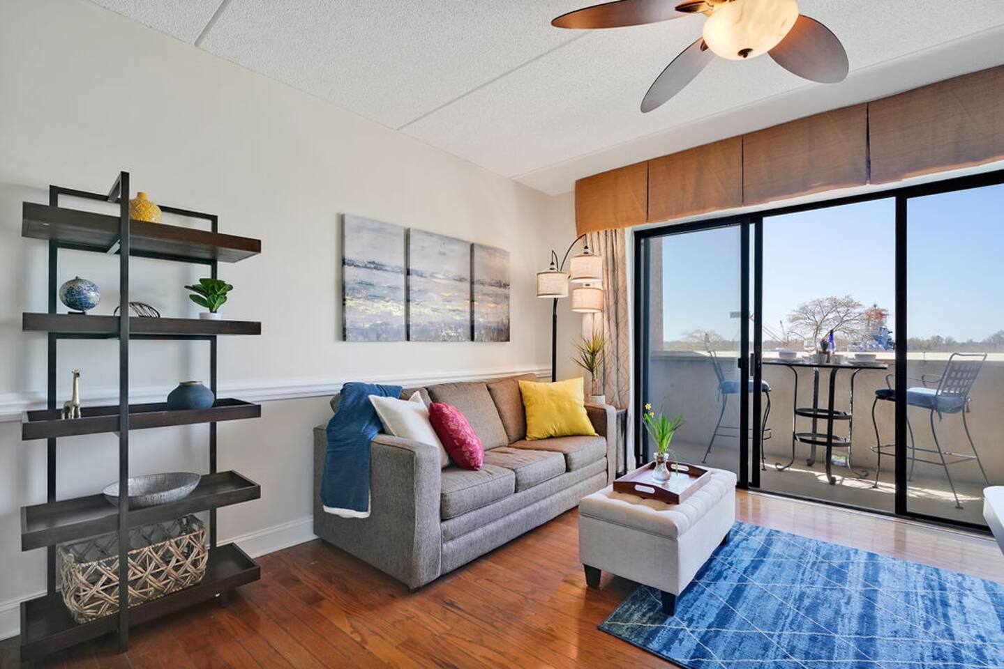 The most walkable location in the heart of downtown Wilmington awaits! Your 1BR condo offers an incredible home base within a short stroll of shops, restaurants, pubs, local attractions, and vibrant nightlife. Spend fun-filled days exploring, then return home to relax on your balcony. Outfitted with alfresco dining, this private outdoor space boasts views of the Cape Fear River, Memorial Bridge, and Battleship North Carolina. LIVING AREA Unwind into vacation mode in the living area. Stretch out on the sofa bed and stream favorite shows on the smart TV. Sliding glass doors lead to the balcony and flood the space with natural light. KITCHEN & DINING Prepare delicious meals in the newly remodeled kitchen. Thoughtful extras include a coffee/wine cart with a Keurig, an electric tea kettle, and wine glasses. The kitchen bar offers two seats. BED & BATH This condo sleeps four guests between the queen sofa bed in the living room and a bedroom. (Theres also a queen air mattress) The bedroom holds a king bed and smart TV, while the guest bathroom has a tub/shower combination. OUTDOOR AREA & AMENITIES The private covered balcony offers a table for two - enjoy dining alfresco amid the river views! EXTRA PERKS & MORE DETAILS Complimentary Wi-Fi and a private/washer dryer are provided. Please note that there is no on-site parking at this building. There is a paid parking lot adjacent to the building and a paid parking deck 2 blocks away. Metered parking is also available in the area. (Street parking is free on Sunday.) This condo is located on the third floor. Elevators are available. LOCATION Located just off the Cape Fear River in downtown Wilmington, this condo has a prime location for exploring the best of the city on foot. Wrightsville Beach is an easy 20-minute drive. Local attractions include the Burgwin-Wright Museum and Gardens, Thalian Hall, the Brooklyn Arts Center, the Bellamy Mansion Museum, and the Cape Fear Museum of History and Science. This rental is located on floor 3. Parking Notes: We provide a parking pass for the new parking garage 1 block north across from The Hotel Ballast. Additional paid parking can be found at the lot adjacent to the building, a paid parking deck 2 blocks away on 2nd Street directly up the hill, and another on the corner of 2nd and Market ($10 per 24 hours). Metered parking ($1.50 per hour) around the building is also available on Princess, Chestnut, Front, and Water streets from 9am to 6:30pm. (Street parking is free on Sundays and overnight.) The River Place next door offers limited inside parking starting at $13/day. Or you can search 'parking downtown Wilmington NC' for more options. You can use the loading area in front of the lobby upon first arriving. We're providing info to help, please check parking rates to verify at the time of your trip. We LOVE our guests. You're the reason we do this and want you to LOVE your stay.