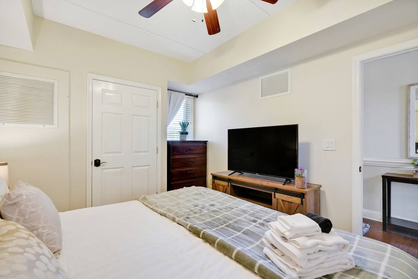 True RIVER FRONT! It's why you're going to Wilmington. No need to miss the best view in town. Right across the Cape Fear River from the Battleship. 1 Bedroom 1 Full Bathroom Kitchen 1 King Bed 1 Queen Sofa Bed Elevator Smart TVs River Front Balcony! This quiet apartment is located in the heart of Wilmington's Historic Downtown restaurant and shopping scene. Take the elevator down and you're there! This is the one you've been looking for!! Expertly managed by our professional hosts.