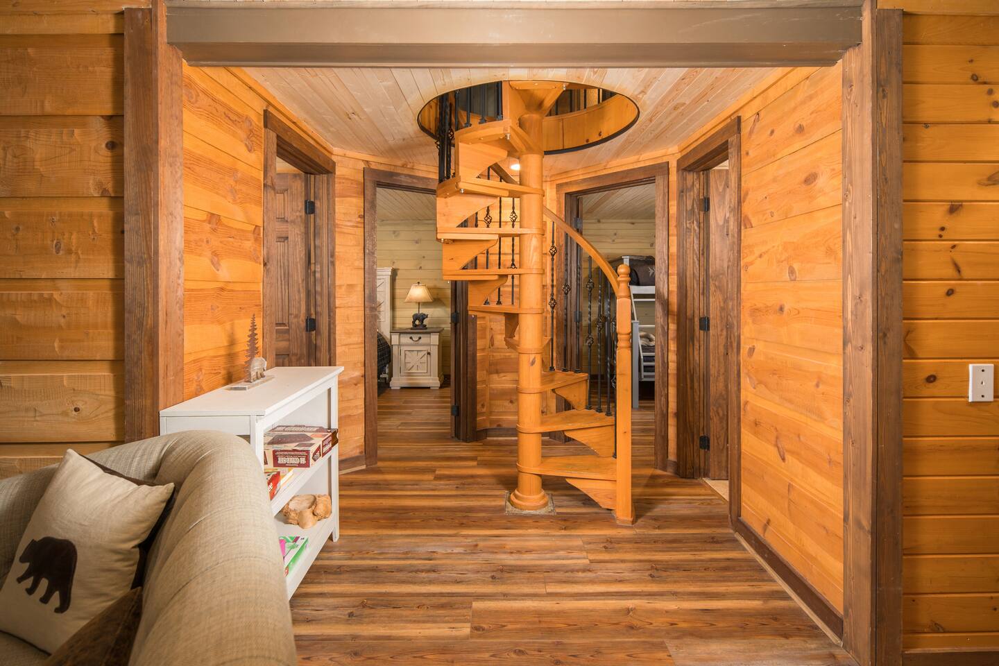 This is a cozy spot nestled at the base of Sugar Mountain, you'll have great views of the slopes right from your private hot tub. While Sugar Mountain is known for its skiing, we're a year round property welcoming guests from all over the world. You'll love the touches we've put in for you and your guests to keep everyone comfy cozy and having a blast. Kids and adults love the hand-hewn spiral staircase. It really feels like you're in a Disney storybook. Don't wait! This is the one you've been looking for. Nestled in the heart of Sugar Mountain, North Carolina. Escape the hustle and bustle of everyday life and immerse yourself in the tranquil beauty of the Blue Ridge Mountains. 4 Bedrooms 2 Queen Beds (one on main floor, one down stairs) 1 Double Bed 4 Twin Beds Room descriptions are in the photos 2 Full Bathrooms Game Room with a Foosball Table Hot Tub (Private for your use only) A Gorgeous Fire Pit Memories that will last a lifetime! Sleeps 10