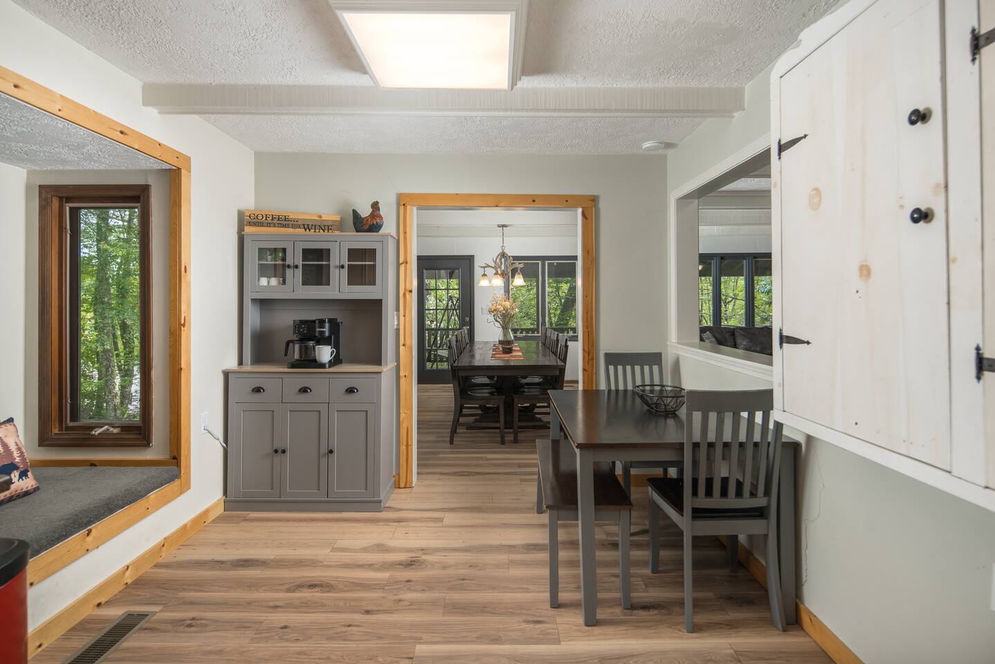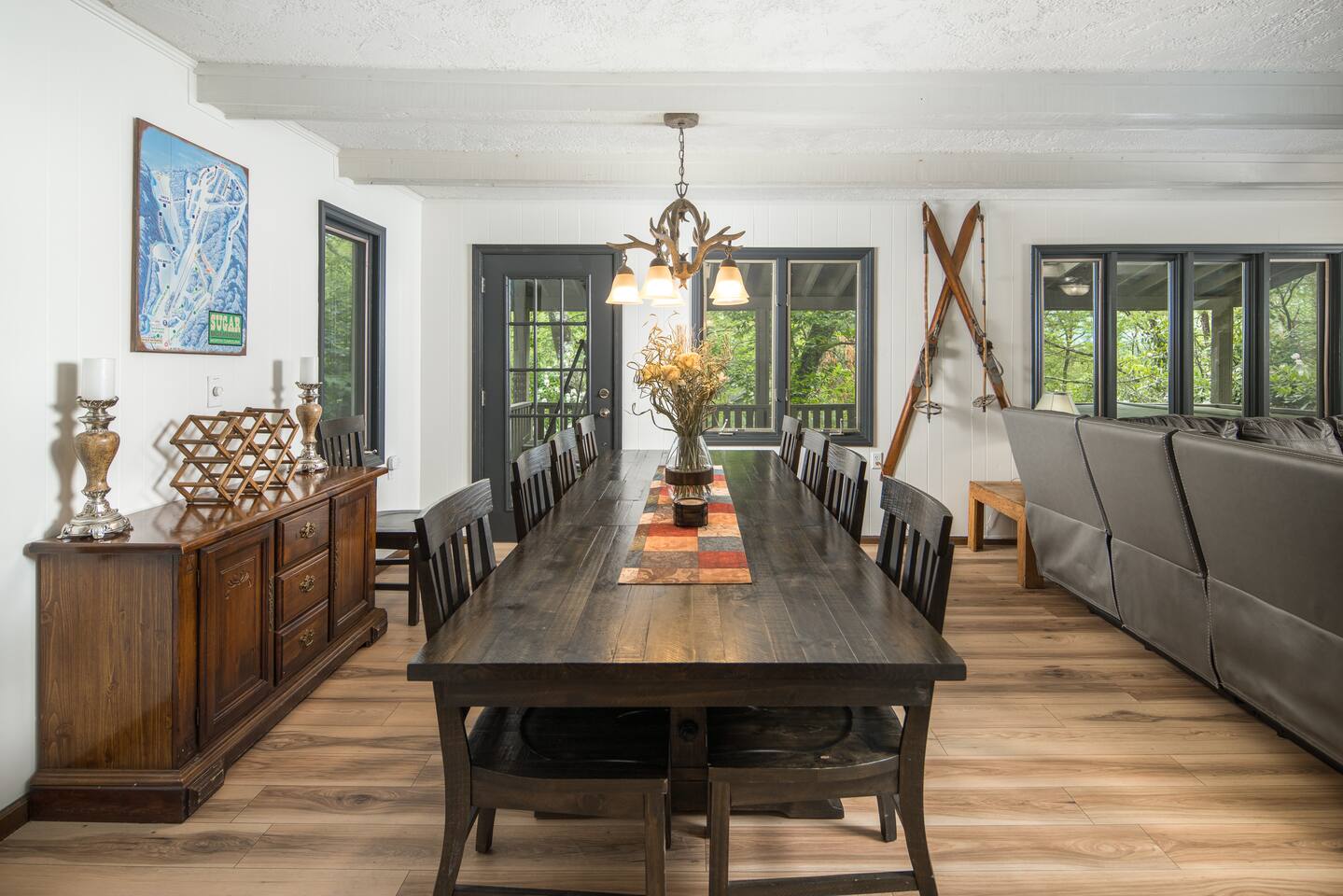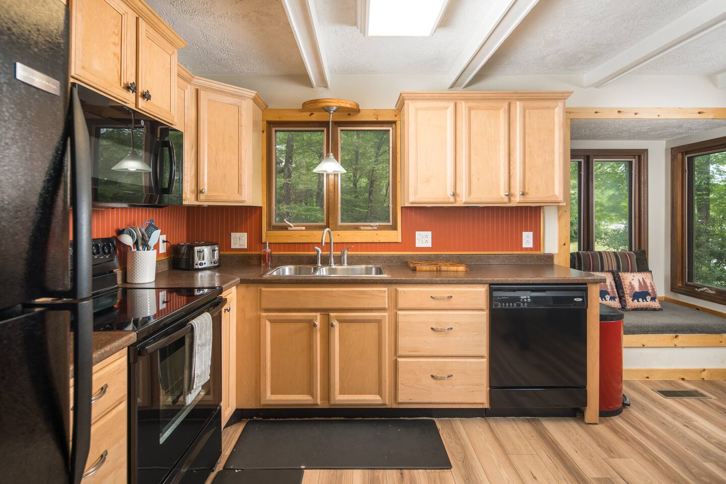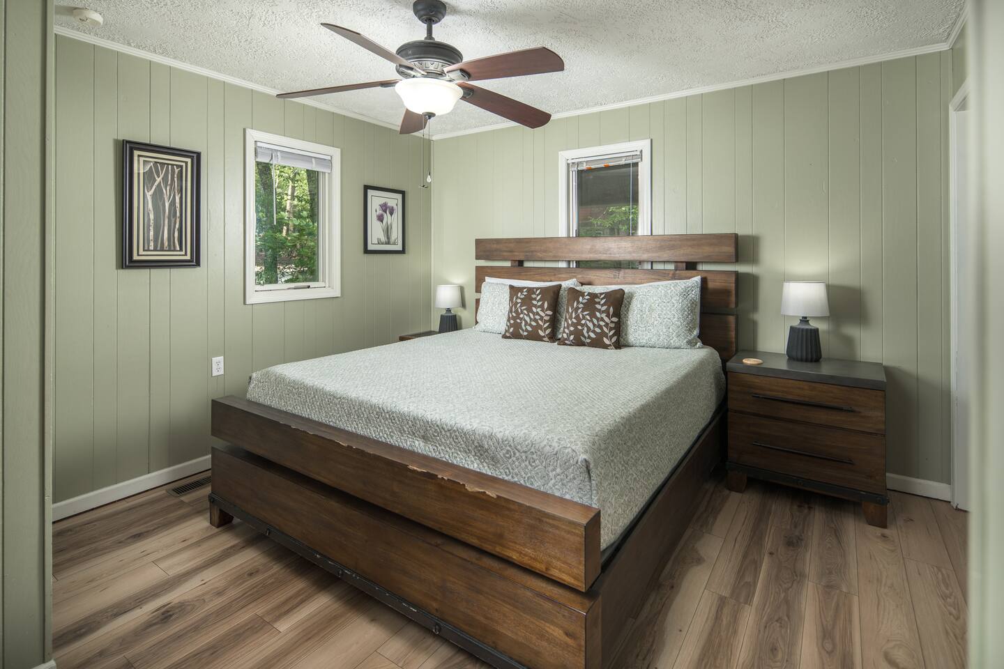 Two-story 5 bedroom chalet nestled in the serene forest next to your very own babbling creek and pond. Walkable to the resort! 2 Wood burning fireplaces 5 Bedroom 3.5 Bathroom 2 King Beds 1 Queen Bed 1 Twin Over Full Bunkbed 2 Twin over Twin Bunkbeds 1 Pullout Couch in family room (Full) A quarter mile to the ski resort on the shuttle line! This the one you've been looking for!